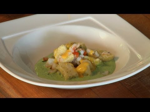 Round Hill's Executive Chef Martin Maginley demonstrates how to make pepper shrimp gnocchi that give an Italian twist to the Jamaican idea of a dumpling. The dish is flavored with scotch bonnets, coconut milk and callaloo.