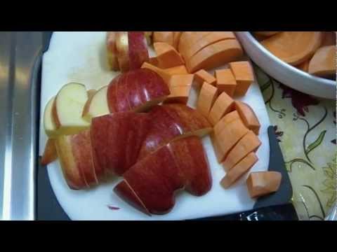 I just sliced up 3 apples and peeled and sliced 3 sweet potatoes and sliced ups the sausage and tossed it all in my large cast iron skillet. I added about a 1/2 cup of chicken stock and put it in the oven for 20 minutes. Then I took it out and gave it a stir and put it back in the oven for 15 minutes.